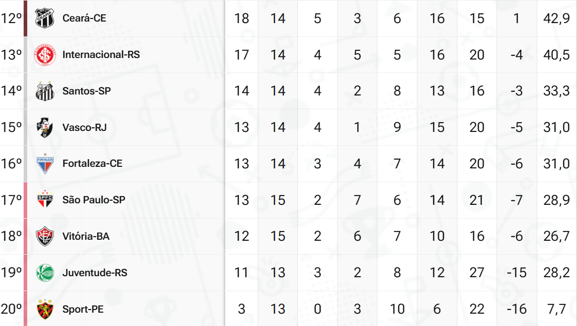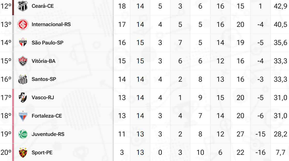 Explico. Porque paradoxalmente, mesmo se o Ceará terminar a rodada em 10º, a distância para o Z4 pode cair para apenas 3 pontos. Isso ocorreria com vitórias de Santos e Vasco.