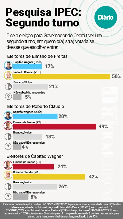 A pesquisa foi encomendada pela TV Verdes Mares e ouviu 1.200 pessoas entre o dia 6 de setembro e a última quinta-feira (8). O levantamento foi realizado pelo instituto Ipec Inteligência e está registrado no Tribunal Superior Eleitoral (TSE) sob número BR-06797/2022 e no Tribunal Regional Eleitoral do Ceará (TRE-CE) sob protocolo CE-08984/2022.