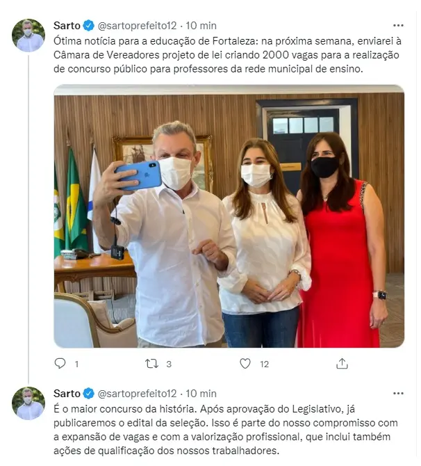 "Ótima notícia para a educação de Fortaleza: na próxima semana, enviarei à Câmara de Vereadores projeto de lei criando 2.000 vagas para a realização de concurso público para professores da rede municipal de ensino", escreveu Sarto na rede social.
