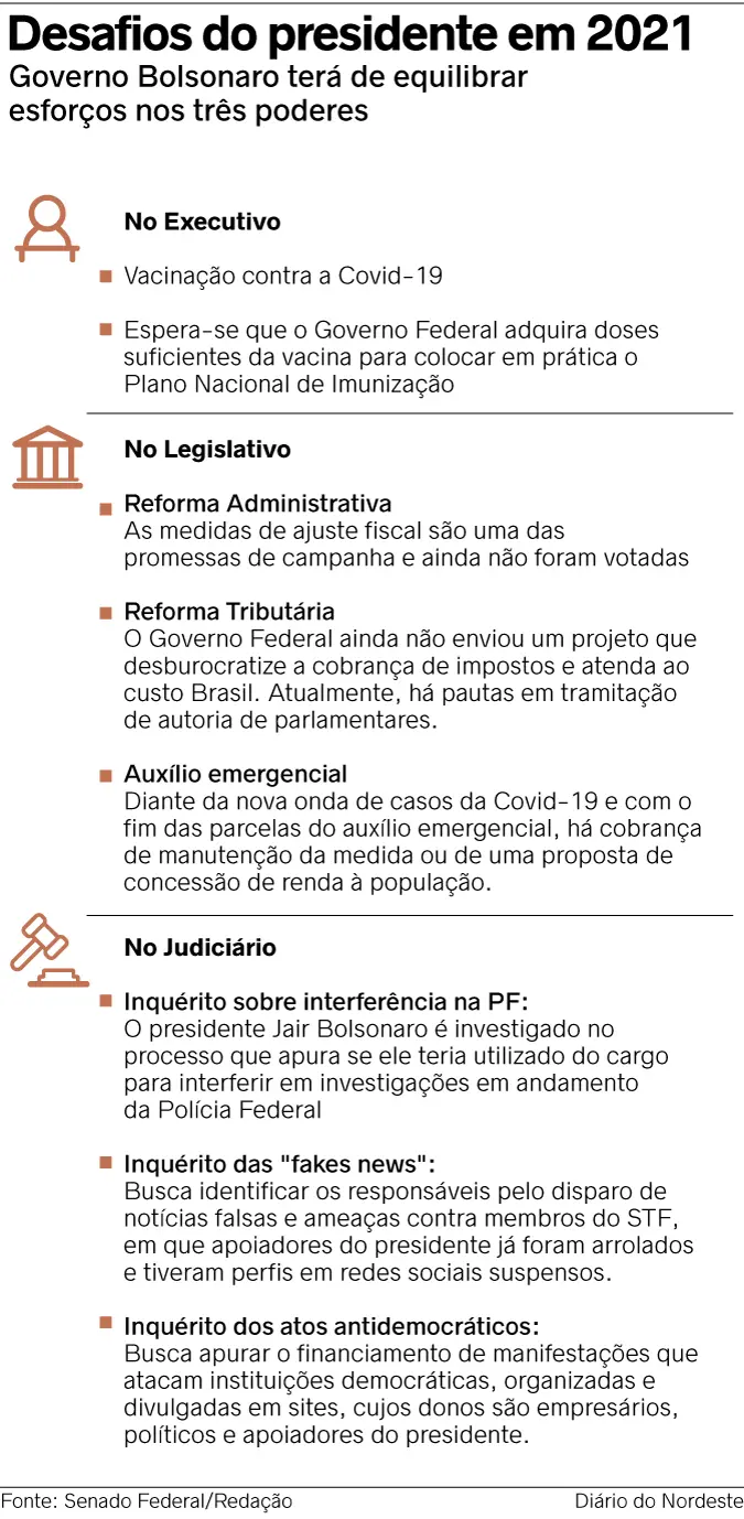 O presidente da República, Jair Bolsonaro, terá pela frente de lidar com reformas a serem aprovadas no Legislativo, análise de inquéritos no STF e uma população inteira a ser vacinada contra a Covid-19