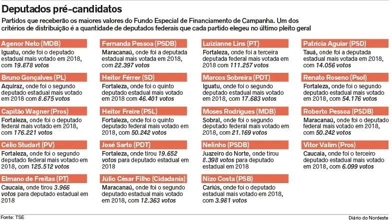 Na corrida eleitoral deste ano, pelo menos, dez deputados estaduais e seis deputados federais cearenses já anunciaram pré-candidaturas a prefeito. O pleito municipal pode mudar a composição da Assembleia Legislativa e da bancada cearense na Câmara dos Deputados, caso parlamentares se licenciem do cargo para focar na campanha, o que não é obrigatório pela legislação eleitoral. Alguns atestam, desde já, que não tirarão licença neste ano. Em outros casos, as articulações para possíveis trocas de cadeira com suplentes estão à espera de definições sobre o retorno das atividades nas Casas Legislativas.