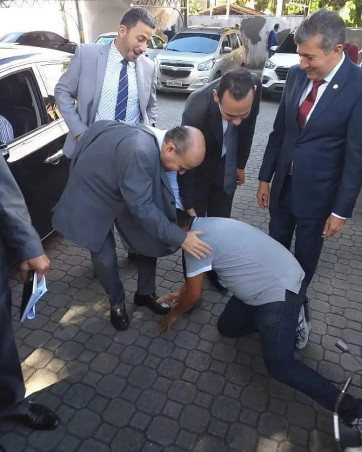 Uma imagem do vereador de Fortaleza John Monteiro (PDT) inclinado aos pés do prefeito Roberto Cláudio circulou na internet com informações de que Monteiro teria beijado os pés do chefe do Executivo, em agradecimento a obras feitas na periferia da capital. O vereador nega.