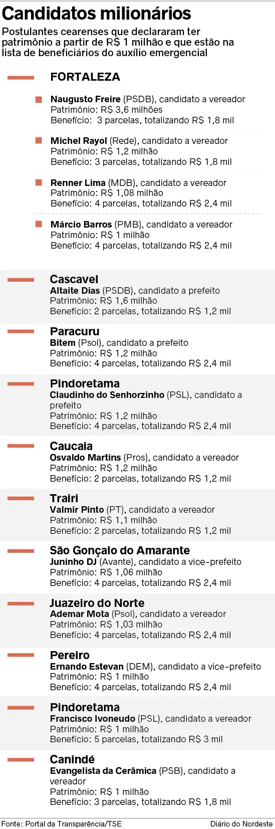 No Ceará, dois candidatos se disseram vítima de golpes e negaram ter solicitado o auxílio. É o caso do postulante a vereador de Fortaleza, Naugusto Freire (PSDB), que é cabeleireiro e declarou R$ 3,6 milhões em bens. Beneficiado com R$ 1,8 mil do auxílio, disse que ignorou o montante.