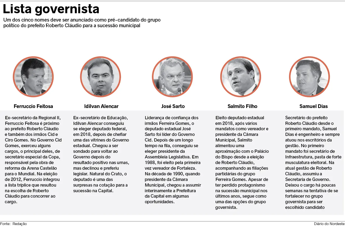 Os pedetistas Ferruccio Feitosa, Idilvan Alencar, José Sarto, Salmito Filho e Samuel Dias participarão de debates nas redes sociais para a definição do nome da sigla para a sucessão. Os embates serão abertos, toda terça e quinta, de 18h às 20h