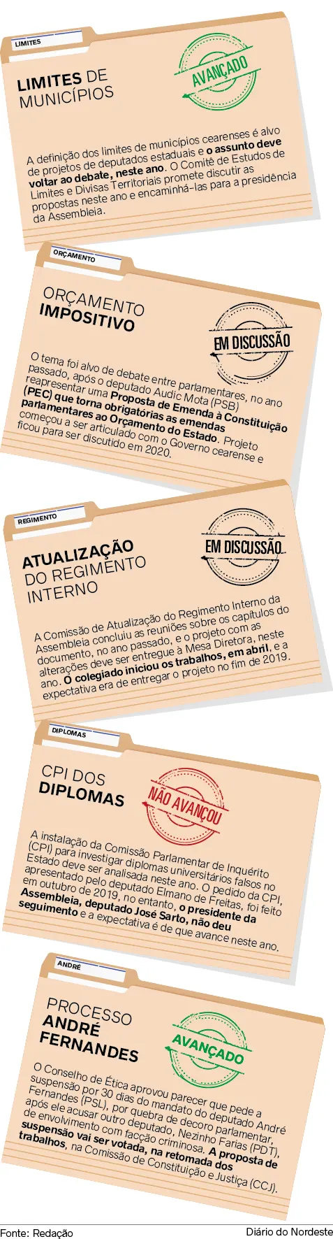 Um deles é a votação final do processo do deputado André Fernandes (PSL) por suposta quebra de decoro parlamentar na Assembleia. O Conselho de Ética aprovou, em novembro do ano passado, o parecer que pede a suspensão por 30 dias do mandato de Fernandes, após ele acusar outro deputado, Nezinho Farias (PDT), de envolvimento com organizações criminosas.