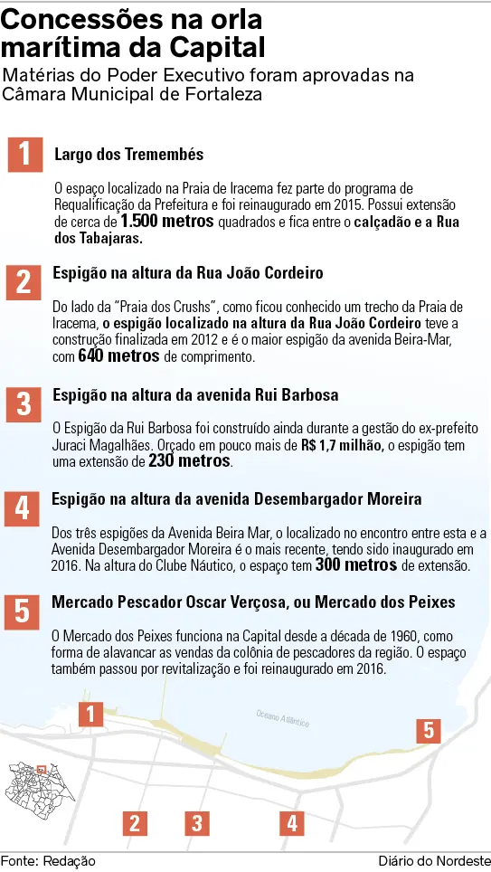 Além disso, no fim do último mês de outubro, os parlamentares já haviam autorizado a concessão do Largo dos Tremembés, localizado na Praia de Iracema. “É um plano da Prefeitura de utilizar espaços públicos que não estão sendo utilizados ou estão subutilizados. O objetivo principal é gerar empregos ao dinamizar a economia e o turismo nessas regiões”, argumenta o secretário de Governo do prefeito Roberto Cláudio (PDT), Samuel Dias.