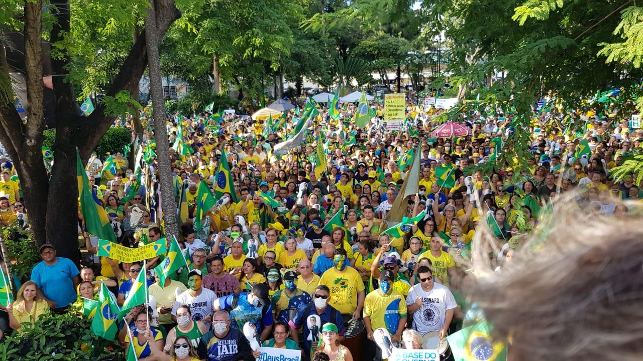 Com pessoas de caras pintadas de verde e amarelo e outras usando máscaras cirúrgicas também pintadas com as mesmas cores, o ato, segundo a organização, tem como pautas principais o apoio ao Governo Bolsonaro e críticas ao Congresso Nacional. Os deputados estaduais André Fernandes e Delegado Cavalcante, ambos do PSL, acompanham a manifestação.
