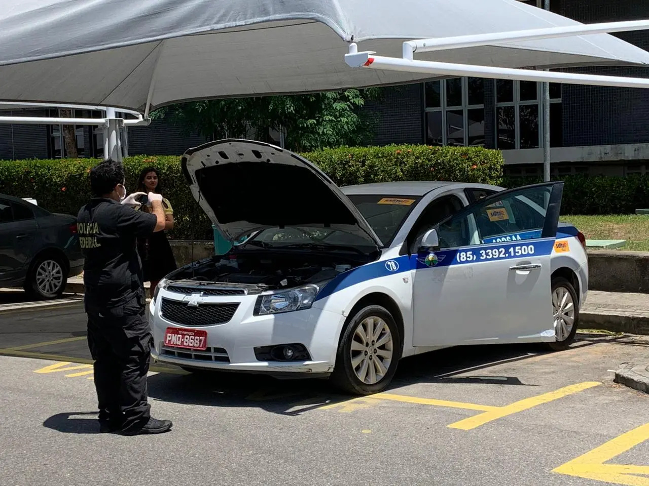 Um táxi que opera no Aeroporto de Fortaleza foi conduzido por policiais militares à sede da Superintendência da Polícia Federal do Ceará, na Capital cearense, por suposta propaganda irregular, na manhã deste domingo (15).