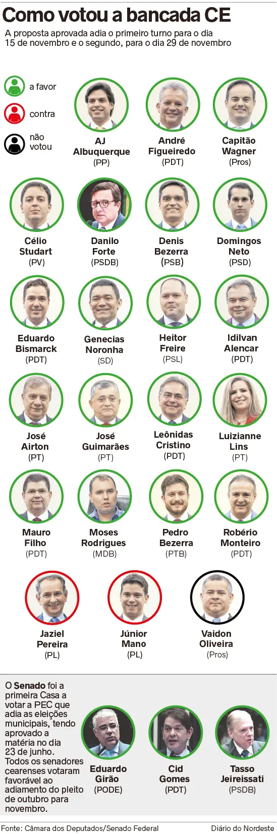 Na votação de ontem (1º) na Câmara, a grande maioria dos parlamentares cearenses se posicionou de forma favorável ao adiamento das eleições de outubro para novembro. Dos 22 deputados, 19 votaram a favor da matéria, dois contrários e apenas um não participou da votação.