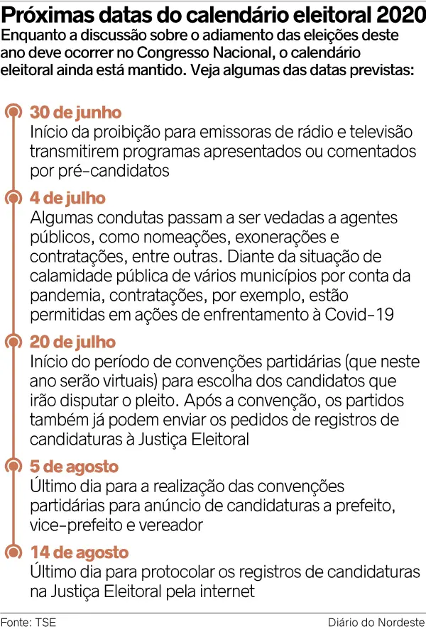Na ocasião, os presidentes da Câmara e do Senado se comprometeram a votar até o fim deste mês uma PEC com as mudanças no calendário eleitoral, já que além do primeiro e do segundo turno, outras datas também devem ser alteradas, respeitando as resoluções do TSE, conforme informaram deputados federais cearenses. O prazo foi sugerido pelo presidente do TSE. Parlamentares do Ceará também concordam que a matéria precisa tramitar com celeridade, para que as datas sejam justas com todos, principalmente com o eleitorado, já que o período das convenções se aproxima e também deve ser adiado, caso siga eventual alteração no calendário.