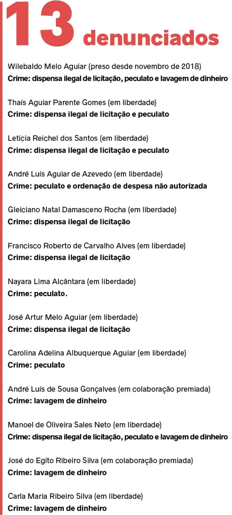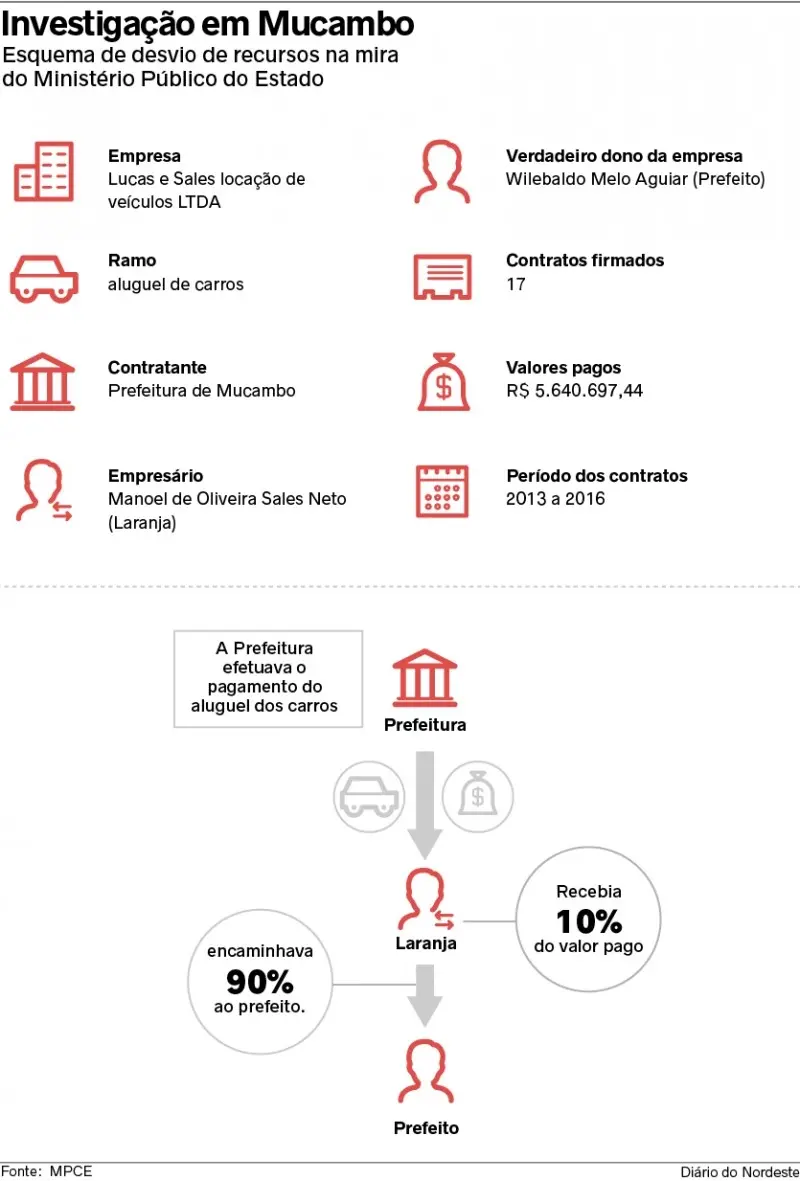 A promotoria de Mucambo acusa o ex-prefeito Wilebaldo Aguiar (PSDB), considerado o chefe do esquema, de liderar fraudes em licitações garantindo a vitória da empresa dele na concorrência dos contratos. Boa parte dos envolvidos nas investigações responde por dispensa ilegal de licitação e de benefício ilegal à locadora de veículos. No processo, constam documentos formalizados pelo departamento técnico de licitação da Prefeitura.