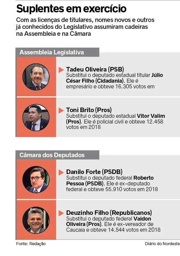 No lugar de Pessoa, assumiu a vaga, no mês passado, o suplente Danilo Forte (PSDB), que obteve quase 56 mil votos na última eleição. O deputado federal Vaidon Oliveira (Pros) também se licenciou da Câmara, após um acordo interno com as lideranças do partido. No seu lugar, entrou o terceiro suplente Deuzinho Filho (Republicanos).