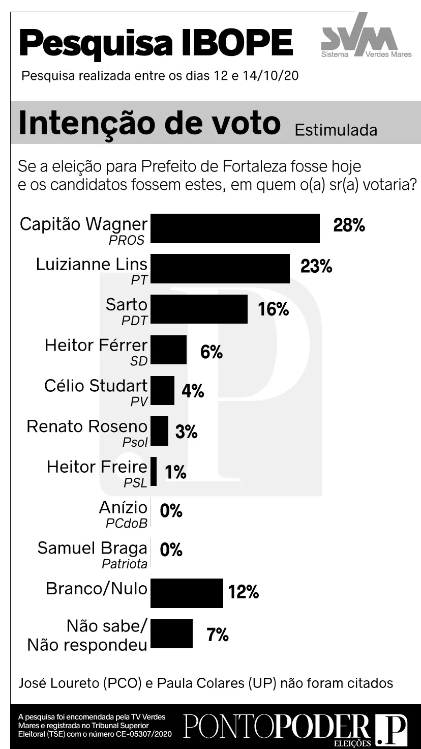 A primeira pesquisa Ibope de intenções de voto para a Prefeitura de Fortaleza nas eleições 2020, divulgada nesta quarta-feira (14) pela TV Verdes Mares, aponta Capitão Wagner (PROS) e Luizianne Lins (PT) em empate técnico, com 28% e 23%, respectivamente. A margem de erro é de quatro pontos percentuais, para mais ou para menos.