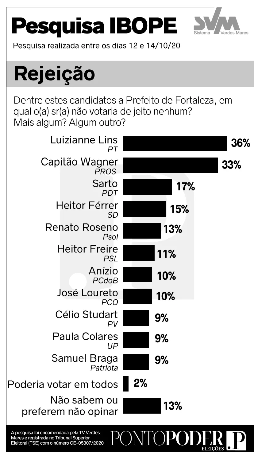 O Ibope também divulgou o índice de rejeição aos candidatos à Prefeitura de Fortaleza. De acordo com a pesquisa, 36% dos eleitores afirmaram que não votariam de jeito nenhum em Luizianne Lins (PT). Capitão Wagner (PROS) aparece com 33% de rejeição. Sarto Nogueira (PDT) tem 17%, conforme o instituto.