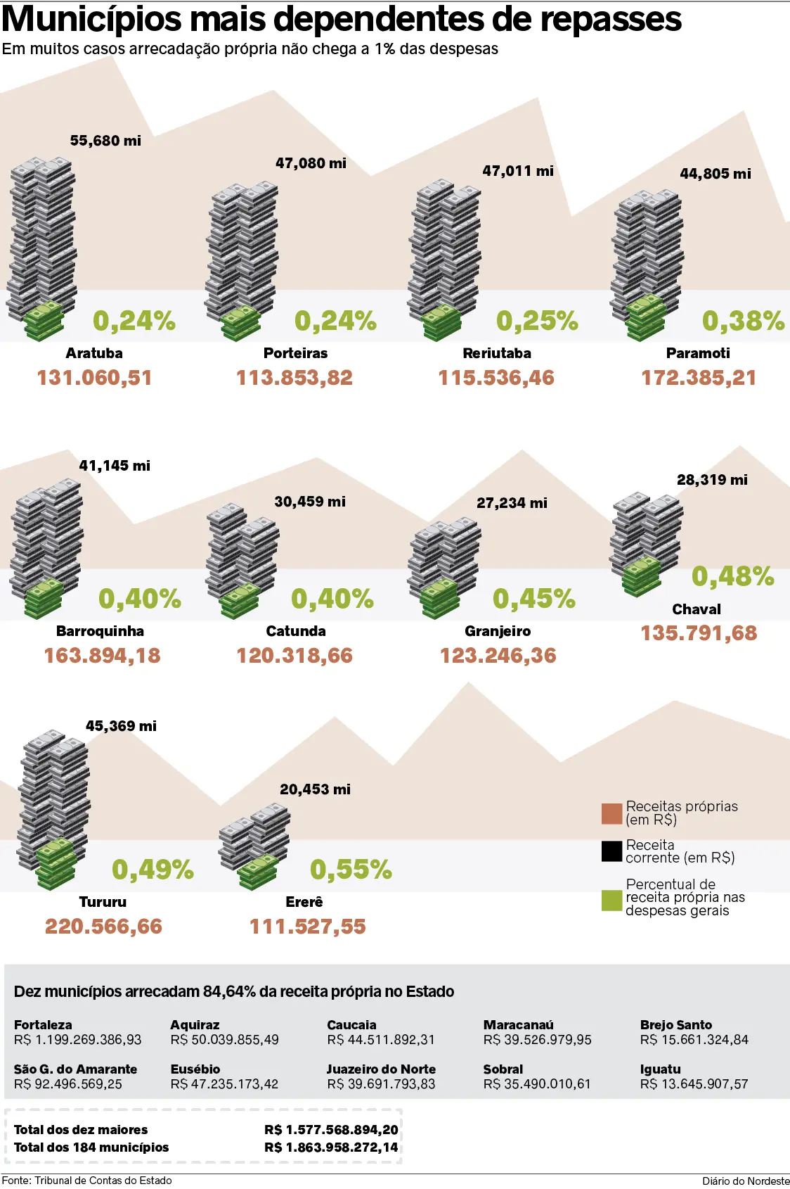 Segundo o TCE, Fortaleza, São Gonçalo do Amarante, Aquiraz, Eusébio, Caucaia, Juazeiro do Norte, Maracanaú, Sobral, Brejo Santo e Iguatu, juntos, somam R$ 1,5 bilhão em receita própria arrecadada. No somatório de todos os 184 municípios, o valor é de R$ 1,8 bilhão.