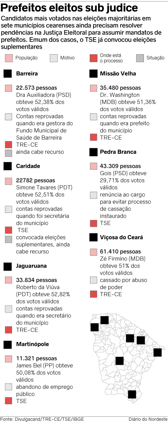 As situações ocorrem nas cidades de Barreira, Caridade, Jaguaruana, Martinópole, Missão Velha, Pedra Branca e Viçosa do Ceará, onde os prefeitos eleitos estão com o registro de candidatura indeferidos (com recursos) por consequência das contas desaprovadas em gestões anteriores, abandonado emprego público e renúncia de cargo em outros mandatos para evitar processo de cassação.