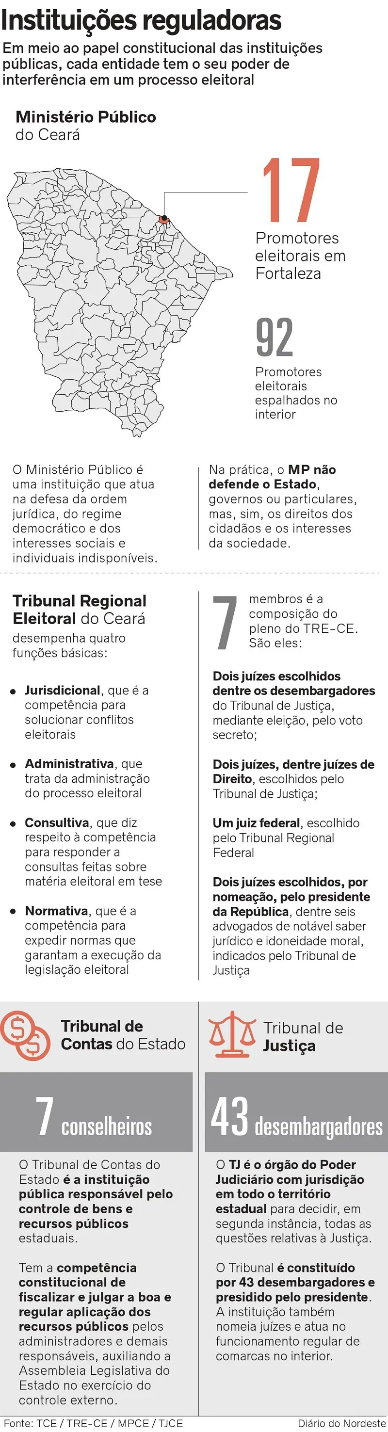O Diário do Nordeste foi à Constituição para tentar explicar com maior clareza aos eleitores cearenses a atuação de órgãos que direta ou indiretamente dão as condições para as escolhas dos nossos representantes. Enquanto o eleitor inicia a pesquisa dos nomes postos, ainda na condição de pré-candidatos, o Tribunal de Contas do Estado (TCE) elabora relatórios de gestores públicos, que incluem prefeitos (as) e secretários (as), meses antes da disputa eleitoral. A fiscalização busca identificar como foi o uso do dinheiro público por aqueles que já estão no poder.