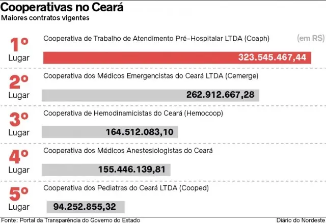A Cooperativa de Trabalho de Atendimento Pré-Hospitalar LTDA (Copah), por exemplo, mantém vínculos com o Estado desde 2013. Atualmente, há 12 contratos em vigência entre a entidade e o Governo, que somam um montante de R$ 323,5 milhões. A maioria está direcionada a compor o quadro de enfermeiros no Hospital Infantil Albert Sabin (HIAS) e também no Hospital Geral de Fortaleza (HGF).