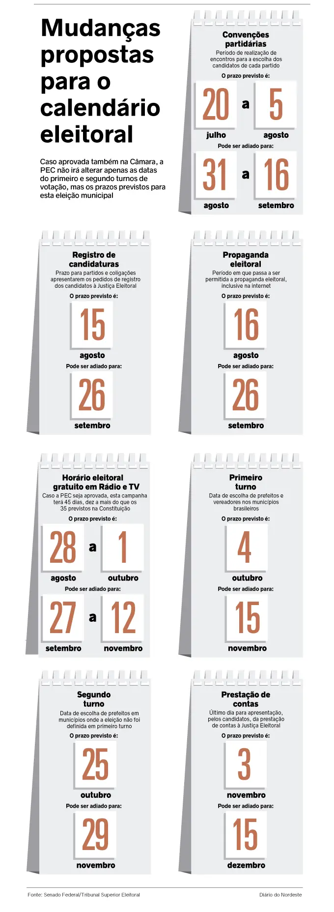 O Senado aprovou na última terça-feira (23) o adiamento das eleições municipais para 15 de novembro - data de votação no primeiro turno - e 29 de novembro, caso as disputas sejam definidas numa segunda etapa. A PEC foi aprovada em dois turnos de votação, com um placar de 64 a 7.