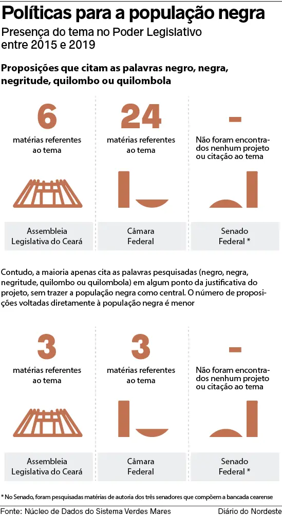 A autodeclaração solicitada pelo Instituto Brasileiro de Geografia e Estatística (IBGE) ainda coloca na mesma categoria negros e pardos. No Ceará, o percentual de eleitos na Câmara dos Deputados e na Assembleia Legislativa em 2018 que assim se declaram é de 40,9% e 28,3%, respectivamente. O índice não se reflete em projetos. No Dia da Consciência Negra, levantamento do Núcleo de Dados do Sistema Verdes Mares (SVM), entre 2015 e 2019, aponta a pouca atenção dos legisladores do Estado às causas de reparação histórica.