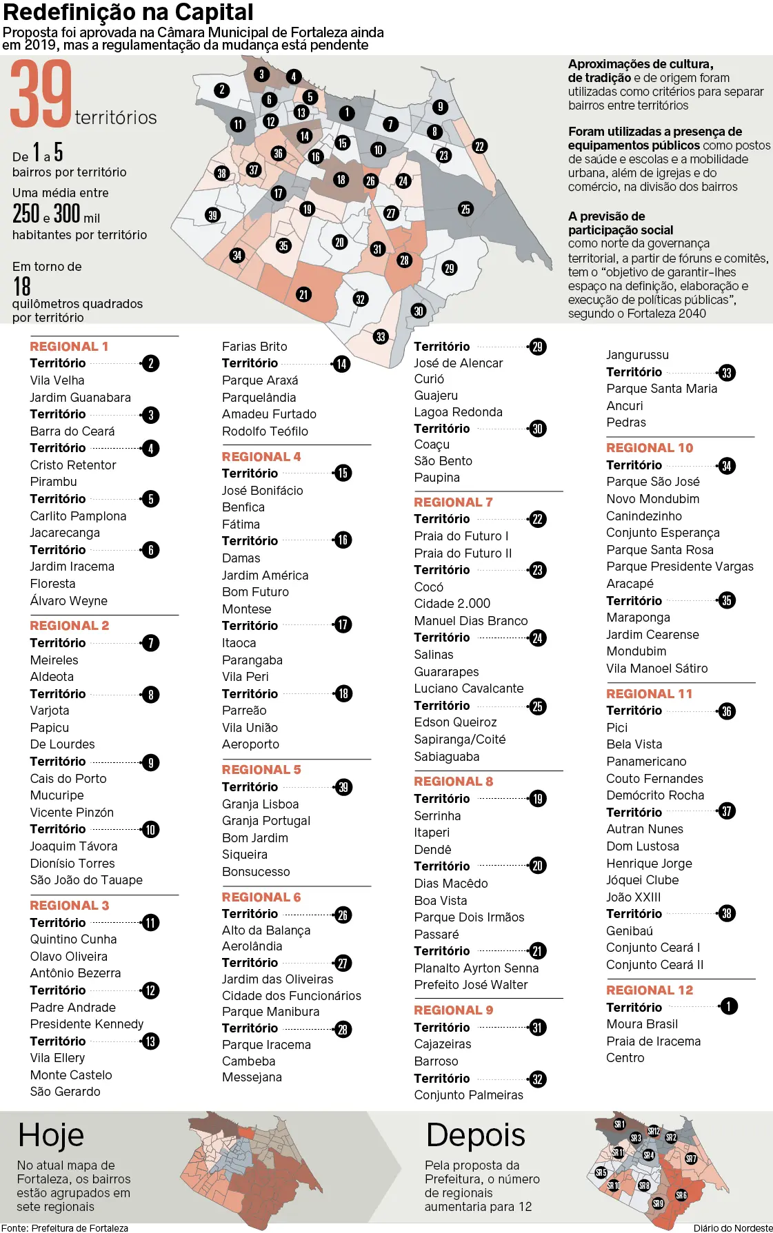 A cidade de Fortaleza passará, ainda neste ano, por uma mudança que aumentará de sete para 12 o número de regionais na Capital. Às vésperas de deixar o cargo, o prefeito Roberto Cláudio (PDT) anunciou que assinará decreto que regulamenta a mudança, tirando do papel um redesenho territorial e administrativo aprovado há mais de um ano na Câmara Municipal. Na prática, a alteração será implementada somente na gestão do futuro prefeito, Sarto Nogueira (PDT), que toma posse no próximo dia 1º de janeiro.