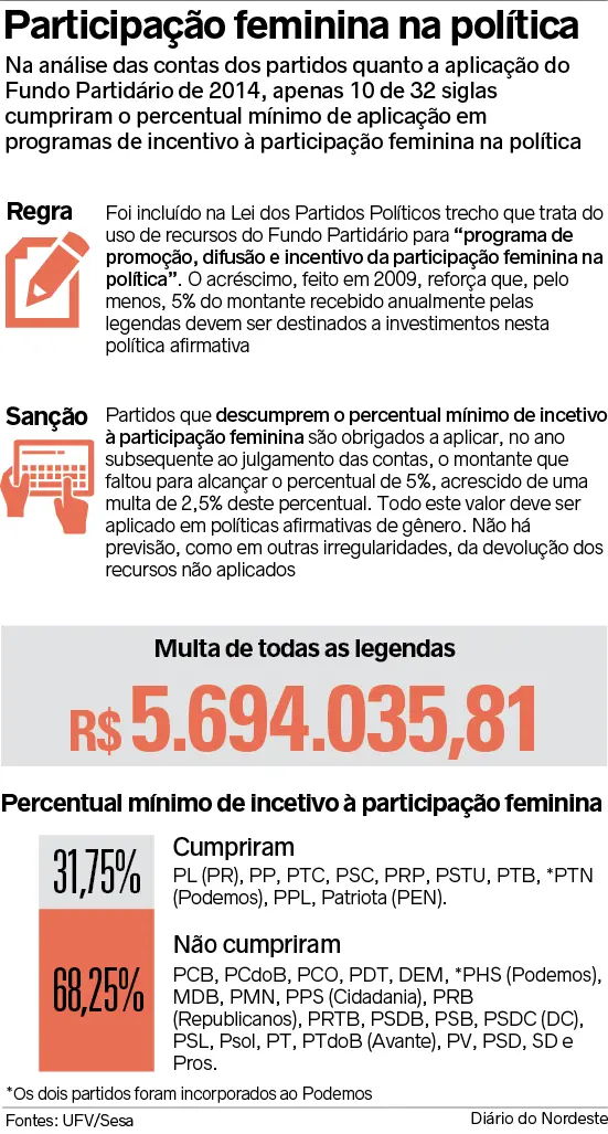 Entre as irregularidades cometidas pelas agremiações partidárias, segundo julgamento concluído pelo TSE com cinco anos de atraso, o descumprimento do percentual mínimo para "promoção, difusão e incentivo da participação feminina na política", como detalha a lei, só perde para a ausência de comprovação de gastos. Conforme mostrado em reportagem da edição de ontem do Diário do Nordeste, 97% das siglas não tiveram contas aprovadas, segundo balanço da prestação de contas de 2014.