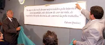 José de Arimatéia Santos, diretor do Grupo Edson Queiroz, com o presidente da Câmara, vereador Carlos Mesquita, descerraram a placa com a frase do empresário Edson Queiroz no plenário do Legislativo municipal. Carlos Mesquita justificou a escolha da frase, por acreditar que os vereadores, “muitas vezes, são injustiçados e precisam de um alento, para não desistirem da carreira pública. Não encontramos nenhuma outra frase melhor”, disse.