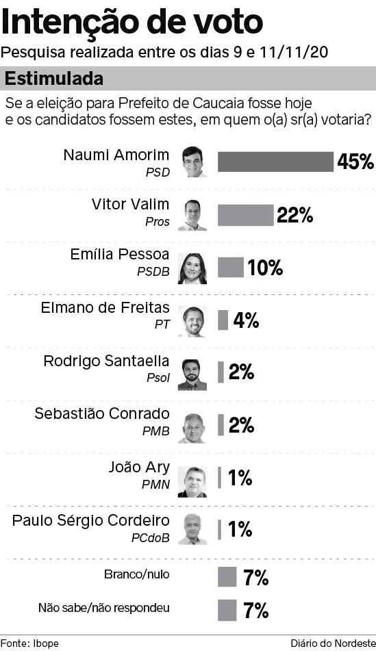 No levantamento estimulado, que é quando os nomes dos candidatos são apresentados ao entrevistado, o gestor aparece com 45% das intenções de voto, seguido de Vitor Valim (Pros), com 22%, e Emília Pessoa (PSDB), com 10%. Projeções do instituto, considerando apenas os votos válidos - quando são excluídos os votos brancos e nulos -, os números apontam que Naumi pode ser reeleito ainda no primeiro turno, considerando a margem de erro que é de 4 pontos percentuais para mais ou para menos.