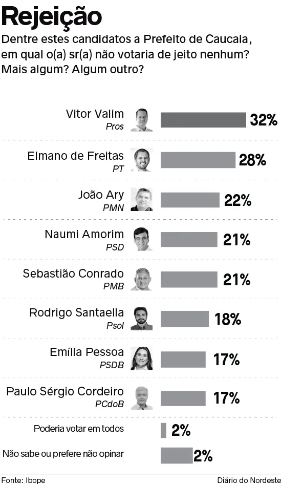 O instituto ainda perguntou aos entrevistados em quem eles não votariam de jeito nenhum - é o chamado índice de rejeição. Neste aspecto, quem lidera é o candidato Vitor Valim, com 32%; em seguida vem Elmano de Freitas, com 28%.