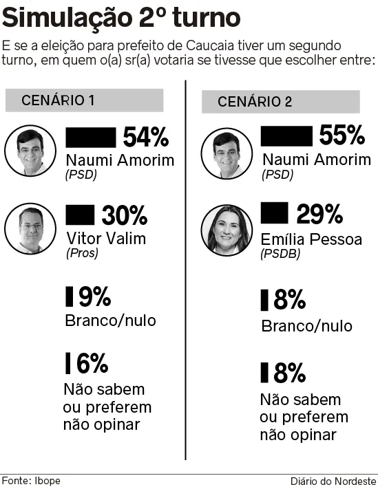 O Ibope também realizou simulações de segundo turno com os entrevistados, perguntando em quem eles votariam em uma eventual nova disputa. Quando são colocados Naumi Amorim e Vitor Valim, lado a lado, o atual prefeito tem 54% das intenções de voto, Já o opositor chega a 30%. Em um duelo entre Naumi e Emília Pessoa, a tucana atinge 29%, frente 55% do candidato à reeleição.