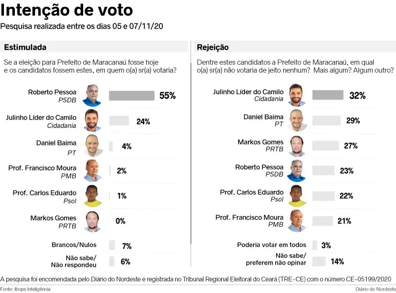 A menos de uma semana para as eleições, a disputa pela Prefeitura de Maracanaú tem a liderança isolada do candidato Roberto Pessoa (PSDB), com 55% das intenções de votos, de acordo com a primeira pesquisa Ibope realizada no município. Encomendado pelo Diário do Nordeste, o levantamento mostra que o candidato Júlio César Filho, identificado na Justiça Eleitoral como Julinho Líder do Camilo (Cidadania), aparece em segundo lugar, com 24% das intenções de votos.