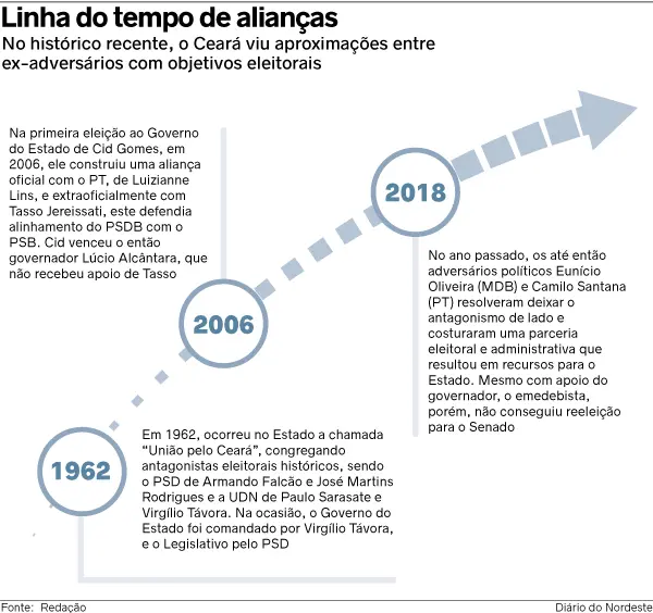 No passado recente, aproximação entre ex-adversários políticos já foi vista no grupo governista do Ceará. Nas eleições gerais de 2018, uma parceria “administrativa” entre o governador Camilo Santana e o então senador Eunício Oliveira (MDB), que disputaram o Governo do Estado em 2014, converteu-se em aliança eleitoral, mesmo a contragosto de alguns integrantes da base aliada do petista. Apesar da estratégia, o emedebista não foi reeleito para o Senado.
