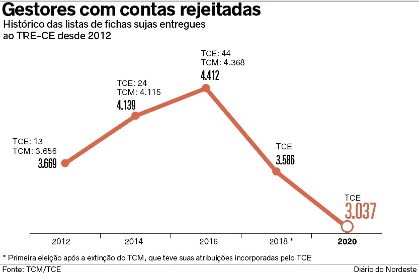O Tribunal de Contas do Estado (TCE) encaminhou ontem (17) ao Tribunal Regional Eleitoral do Ceará (TRE-CE) e ao Ministério Público Eleitoral (MPE) a lista de 3.037 pessoas que tiveram contas relativas ao exercício de funções ou cargos públicos rejeitadas por irregularidade insanável ou por decisão irrecorrível, nos últimos oito anos. A relação é uma das principais fontes de casos de candidatos que se tornam "fichas sujas", ficando proibidos de disputar eleições.