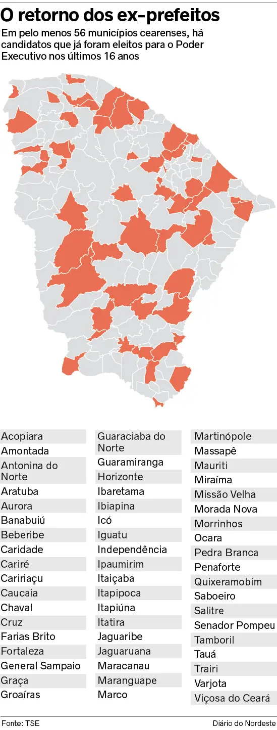 Em alguns municípios cearenses, eleitores devem se deparar com antigos conhecidos nas urnas. Levantamento realizado pelo Sistema Verdes Mares identificou que, pelo menos, 57 ex-prefeitos tentam retornar ao comando dos executivos municipais.