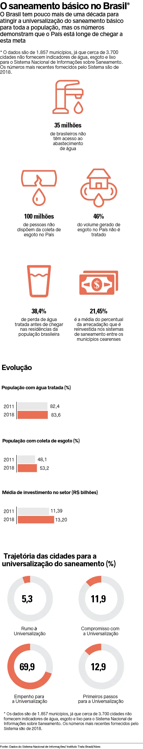 Para se ter uma ideia, em pleno século 21, quando se pede para que o nosso povo lave as mãos, há 35 milhões de brasileiros sem água tratada. É um grande paradoxo. Com mais de 100 milhões de brasileiros sem coleta e tratamento adequado de esgoto, temos sido castigados por toda sorte de outras doenças. A falta de saneamento básico é responsável por 350 mil internações hospitalares a um custo de quase R$ 6 bilhões, e mais importante ainda, uma inestimável perda de vidas por doenças que poderiam ser evitadas com água e esgoto tratados.