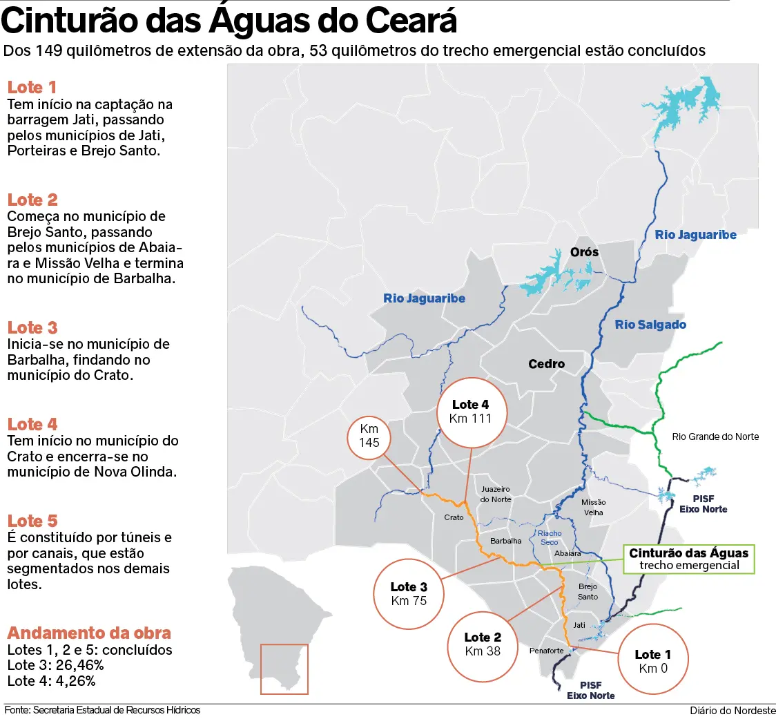 Ao todo, o Cinturão das Águas do Ceará deverá ter 149 quilômetros de extensão, os quais são divididos em cinco lotes. Desse total, 53 quilômetros da obra já estão prontos, correspondentes aos lotes 1, 2 e 5, responsáveis pelo trecho emergencial.