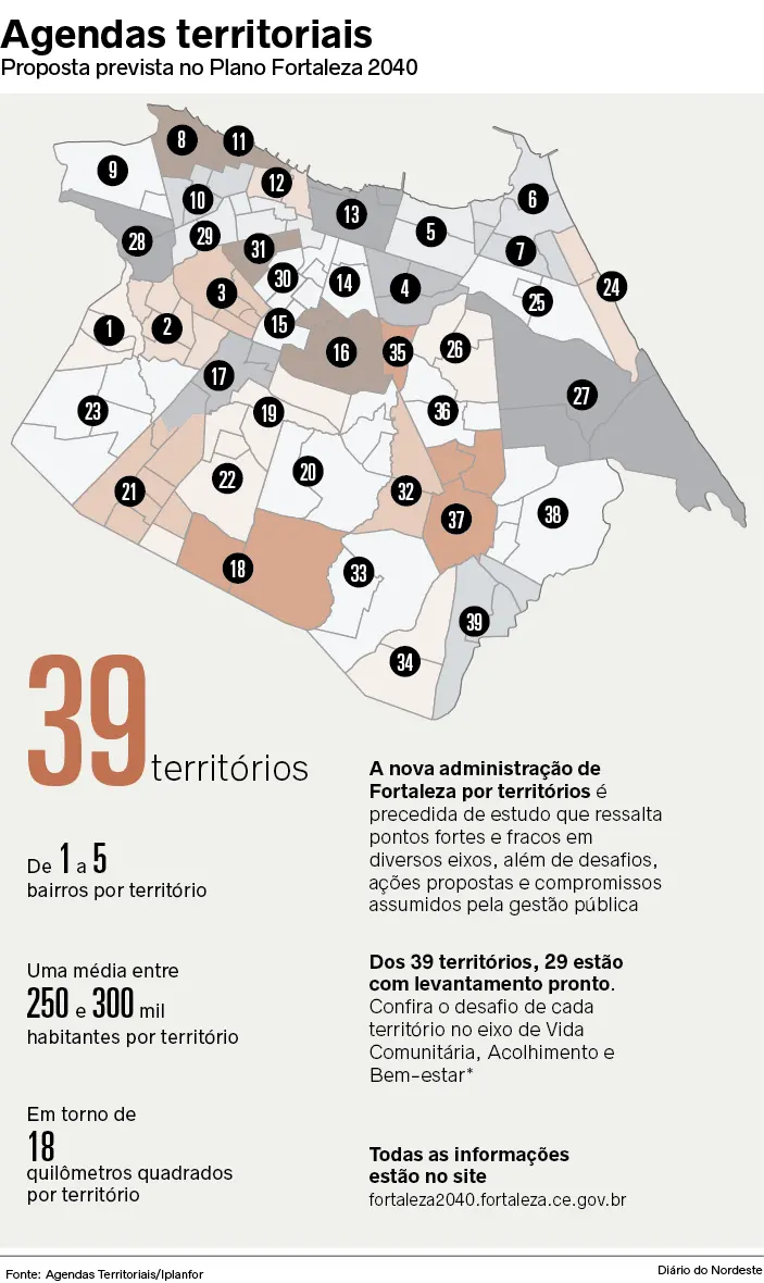 Para pôr em prática a mudança de planejamento, a Prefeitura precisa aprovar, no Poder Legislativo, a criação da nova divisão territorial. Conforme o Instituto de Planejamento de Fortaleza (Iplanfor) há 39 territórios mapeados a serem divididos em 12 unidades de gestão regional, em substituição às sete atuais.