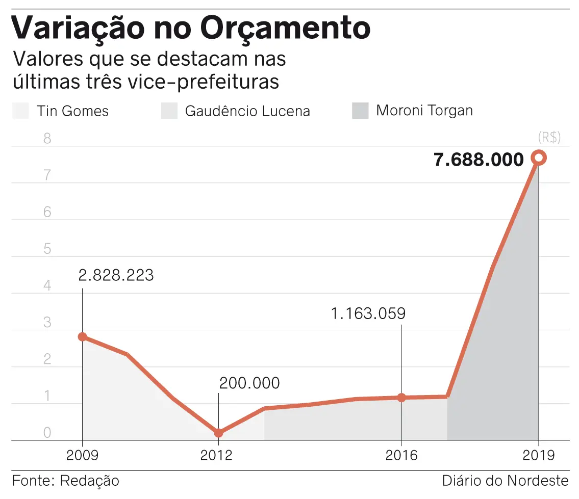 Em relação a 2009, os recursos da Vice-Prefeitura cresceram 171%. Esse número, entretanto, não conta toda a história. Entre 2009 e 2012, quando a cidade teve Luizianne Lins (PT) e Tin Gomes (PDT) como prefeita e vice-prefeito, o que era destinado a Gomes viu uma redução expressiva. O orçamento começou em R$2,8 milhões e terminou em apenas R$ 200 mil, valor mais baixo dos últimos dez anos. Desde o orçamento de 2013, o valor cresceu nominalmente em todos os anos.