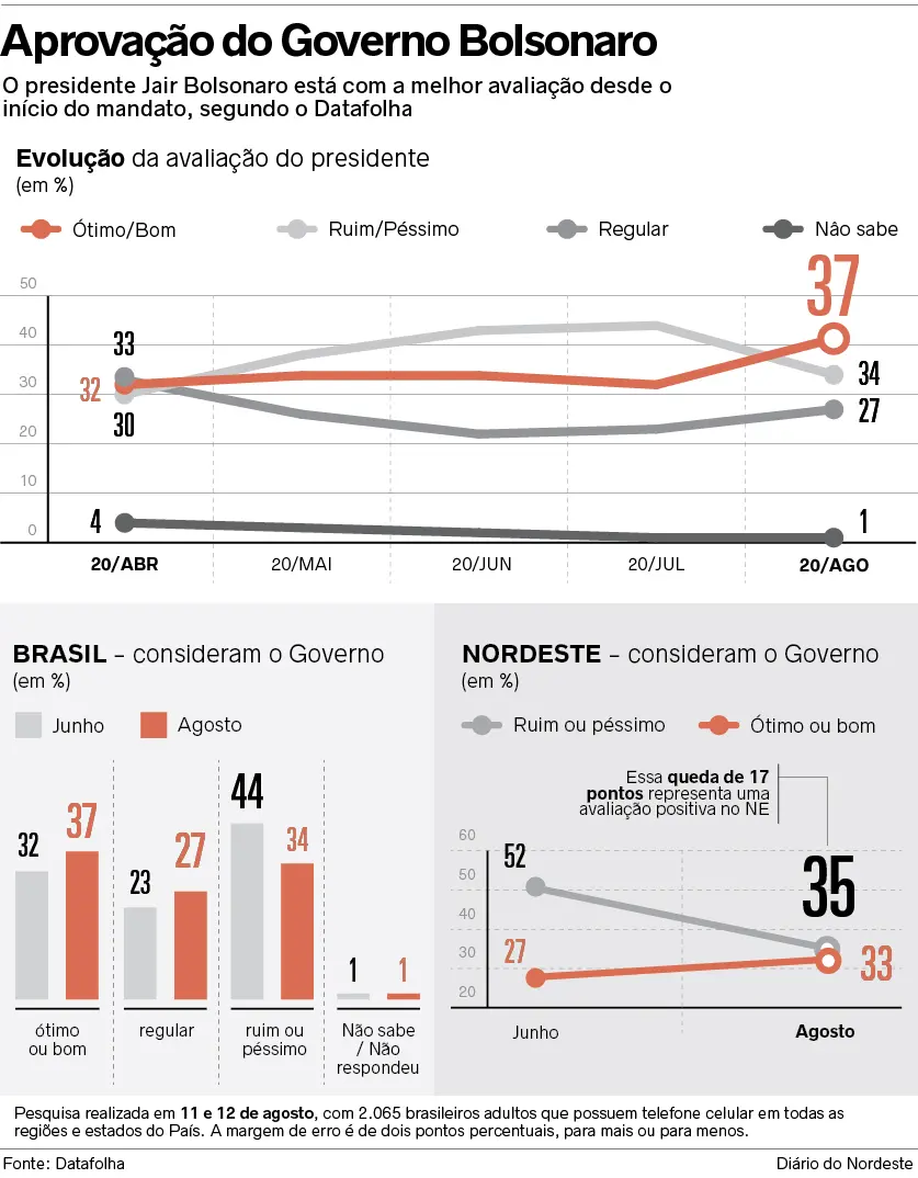 O presidente Jair Bolsonaro atingiu, em agosto, a melhor avaliação do seu Governo desde que assumiu o mandato, especialmente no Nordeste. É o que mostra pesquisa Datafolha, divulgada ontem (14).