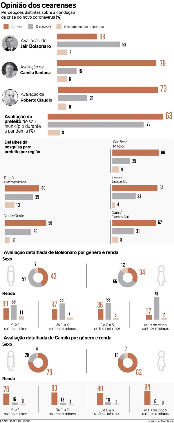 Pesquisa de opinião realizada pelo Instituto Opnus e contratada pelo Sistema Verdes Mares (SVM) mostra a avaliação da atuação dos governantes, nos três níveis de poder, durante a pandemia do novo coronavírus. Segundo os dados, as medidas adotadas pelo governador Camilo Santana (PT) têm a aprovação de 79% da população cearense. Em relação ao prefeito de Fortaleza, Roberto Cláudio (PDT), 73% aprovam as medidas. Já a avaliação da atuação do presidente Jair Bolsonaro (sem partido) revela a aprovação de 38% dos entrevistados no levantamento.