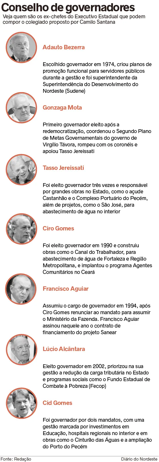 Além de Camilo Santana, o Conselho deve reunir os ex-governadores Adauto Bezerra, Gonzaga Mota, Tasso Jereissati (PSDB), Lúcio Alcântara (PL), Ciro Gomes e Cid Gomes, ambos do PDT, e Francisco Aguiar, ex-conselheiro do extinto Tribunal de Contas dos Municípios do Ceará (TCM-CE).