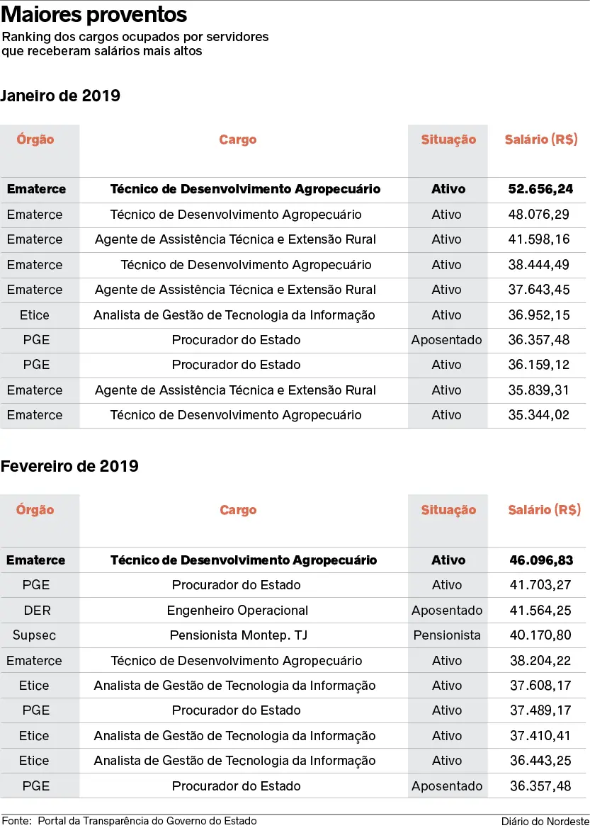 No último mês de fevereiro, uma técnica de desenvolvimento agrário (os nomes foram abreviados para preservar a identidade), por exemplo, ganhou uma média de R$ 46 mil de salário líquido. Já em janeiro deste ano, outro servidor, que tem a mesma função na Ematerce, embolsou R$ 52.656,24 no fim do mês, com os descontos. Coincidentemente, esse mesmo funcionário foi dono de um dos dez maiores salários pagos pelo Governo do Estado em janeiro de 2018.
