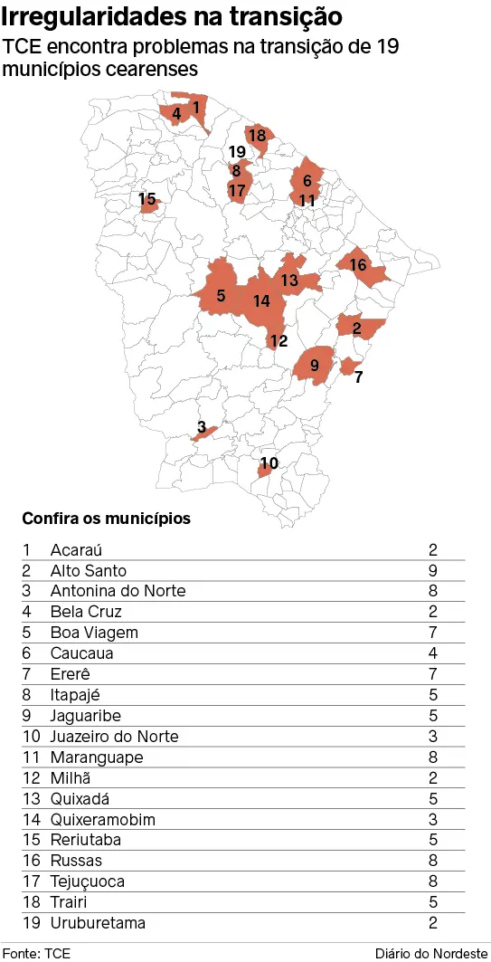 Nos outros 13 municípios, os problemas se concentram em torno de obstáculos na transição e risco de iminente descontinuidade dos serviços públicos. Conforme apontam os auditores nos relatórios, há constante risco, nas prefeituras inspecionadas, de não transmissão de arquivos e dados físicos às novas gestões. Casos do tipo ocorrem em Reriutaba, Antonina do Norte, Caucaia, Boa Viagem, Itapajé, Alto Santo, Ererê, Tejuçuoca, Russas, Trairi, Jaguaribe, Quixadá e Reriutaba, indicam os documentos de inspeção.