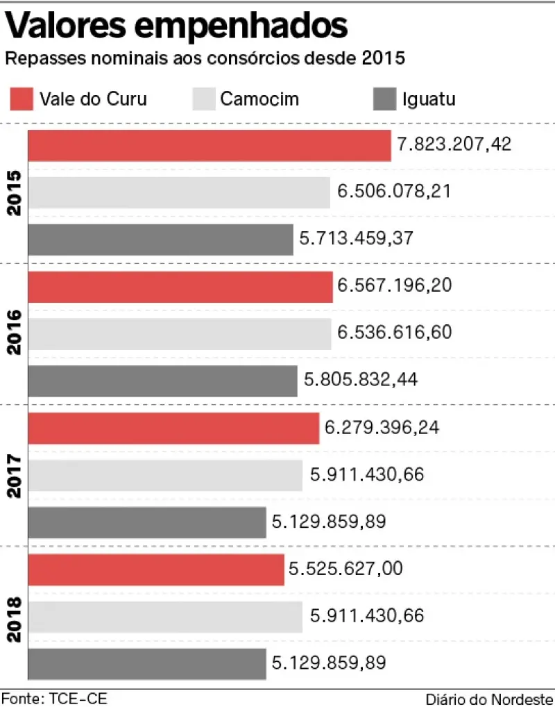 De acordo com Raimir Holanda, secretário de Controle Externo da Corte de Contas, o terceiro foi o único escolhido pelos dois órgãos. E o motivo foi seu tamanho. "Esse é o maior consórcio dos 21 que existem", declara. Ao todo, em 2018, foram empenhados R$ 106 milhões pelo Tesouro estadual para os consórcios.