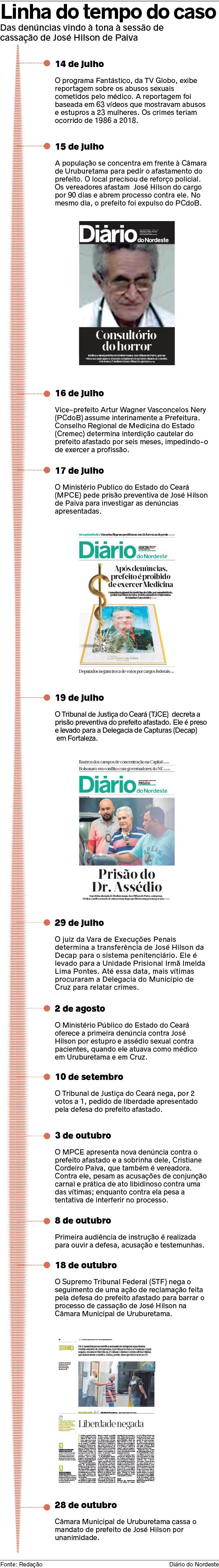 As primeiras denúncias contra José Hilson datam de 1986. Em 1994, outras duas mulheres também o denunciaram. Os casos, no entanto, não avançaram e foram arquivados. Em 2018, outras mulheres voltaram a denunciar o prefeito cassado. As investigações, todavia, começaram a ter andamento mais célere neste ano, o que levou, inclusive, o gestor à prisão, onde se encontra até hoje.