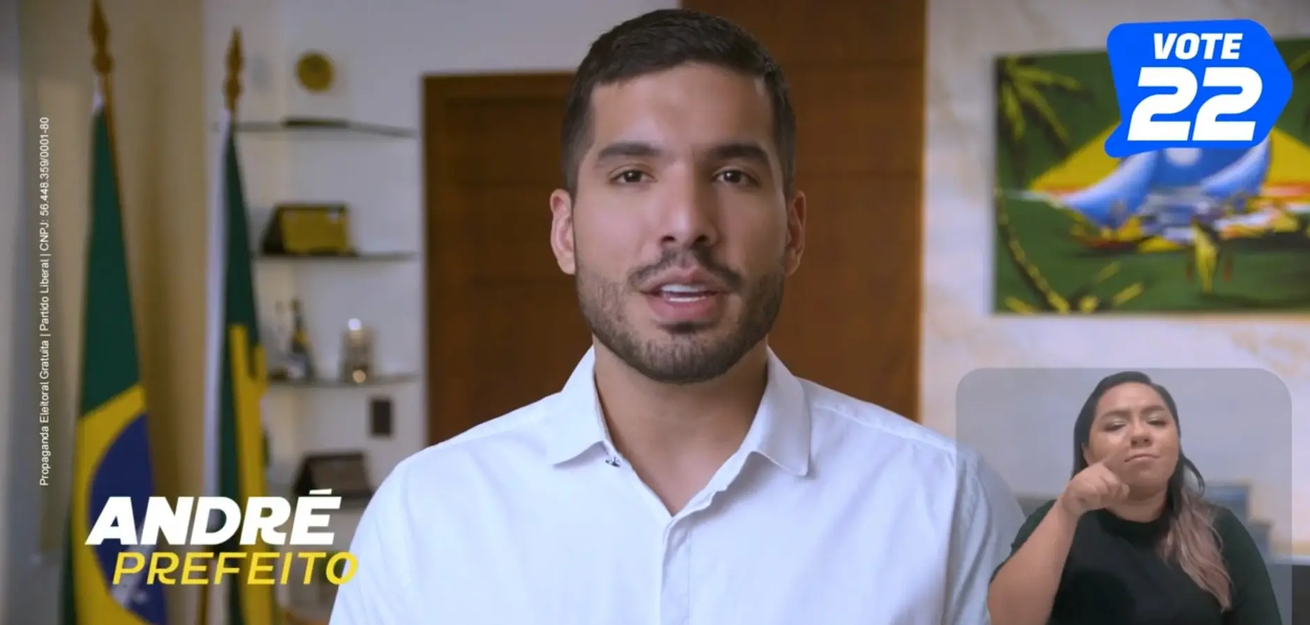 A peça publicitária de André começa com ato recente do candidato no bairro Bom Jardim, ao lado do deputado federal Nikolas Ferreiras (PL-MG), no momento em que fazem a oração do Pai-Nosso, com coro de uma multidão de apoiadores no local, na noite da quinta (24).