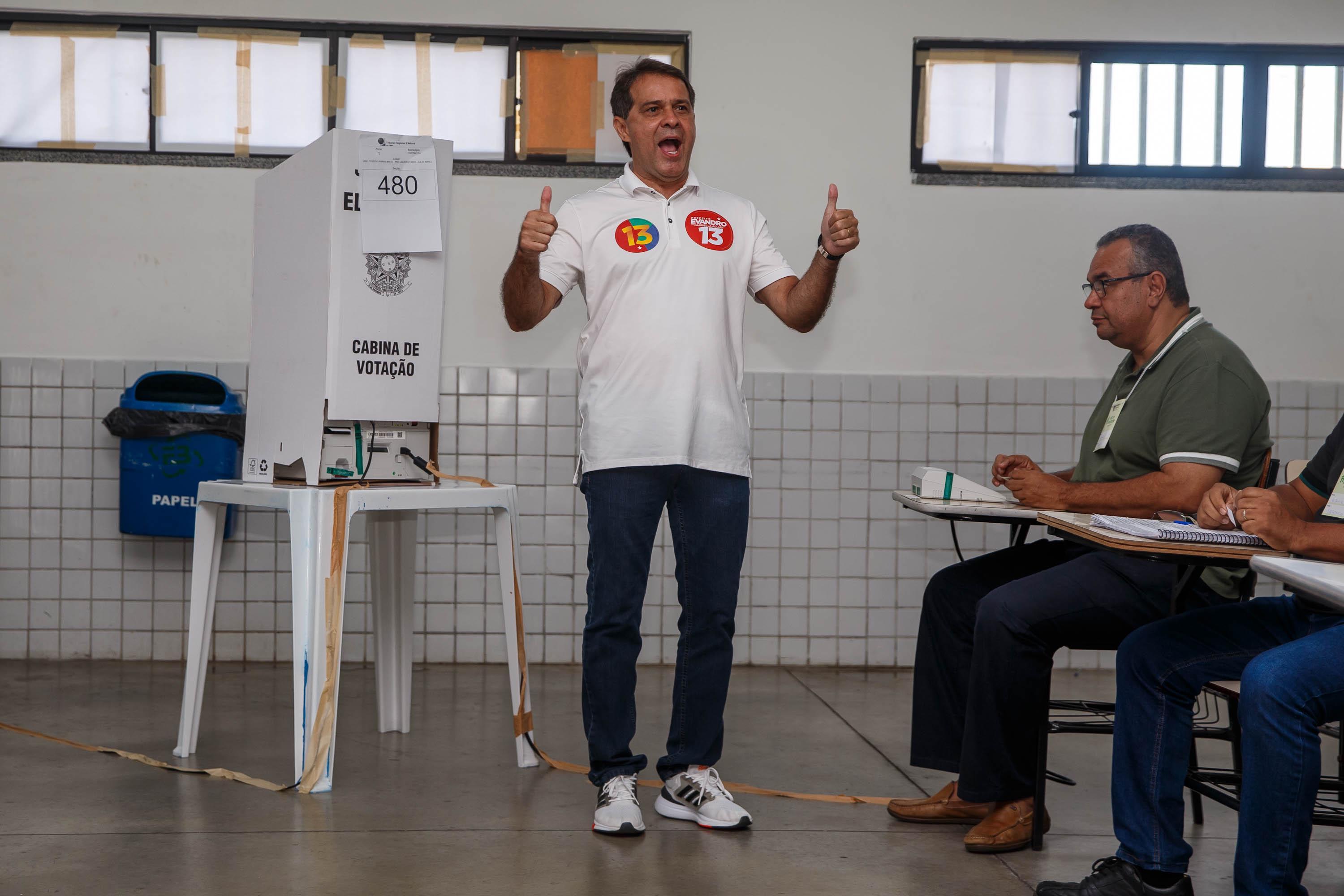 O candidato à prefeitura de Fortaleza, Evandro Leitão (PT), votou na manhã deste domingo (27) no Centro Universitário Farias Brito, na Varjota. Ele estava acompanhado da esposa, Cristiane Leitão, do governador do Estado, Elmano de Freitas (PT), da vice-governadora, Jade Romero (MDB), e do ministro da educação, Camilo Santana.