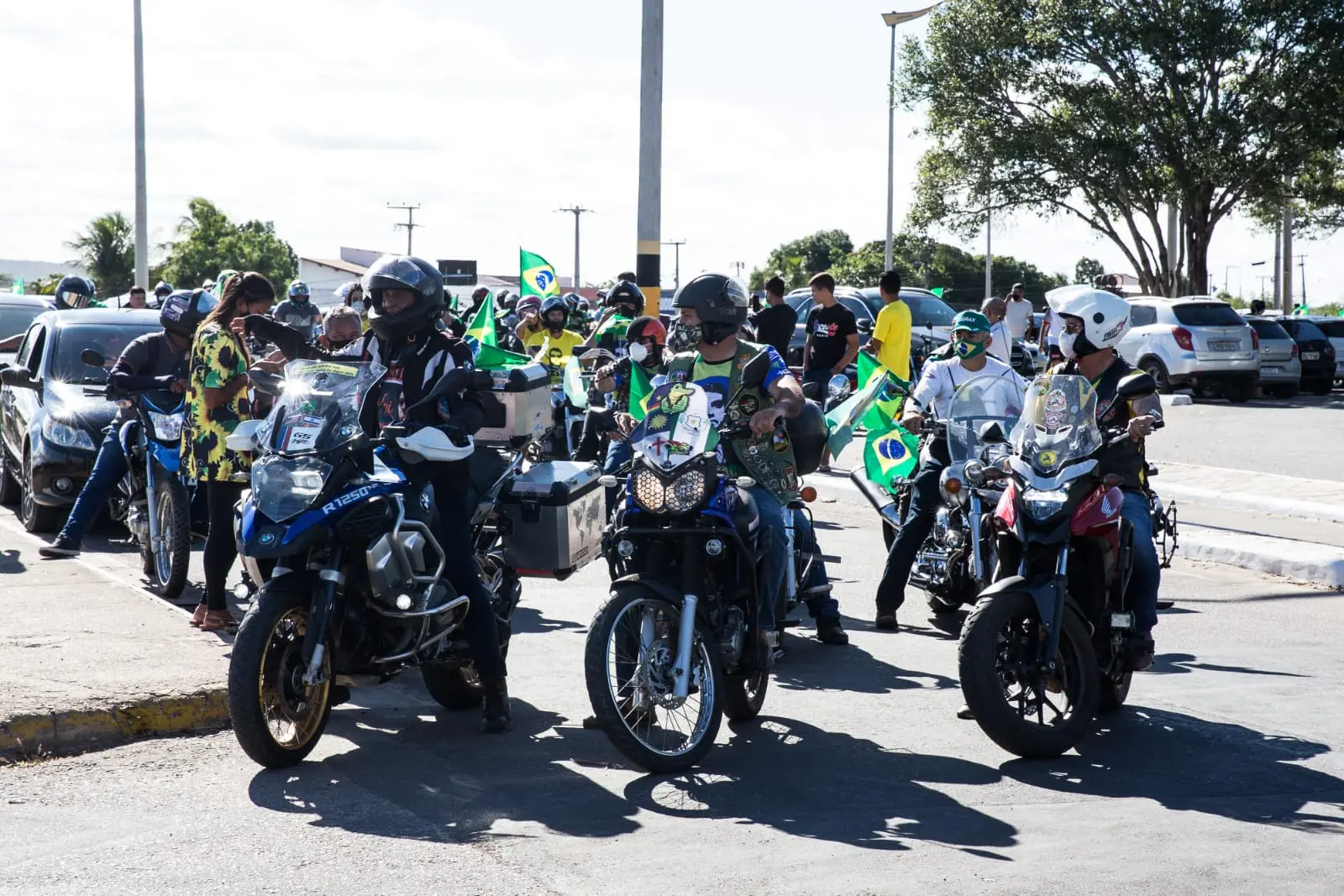 Vários motoqueiros estão em frente ao aeroporto, com bandeiras, faixas e carros de som tocando o hino do Brasil. O trânsito no local está complicado. Muitos vieram de longe.