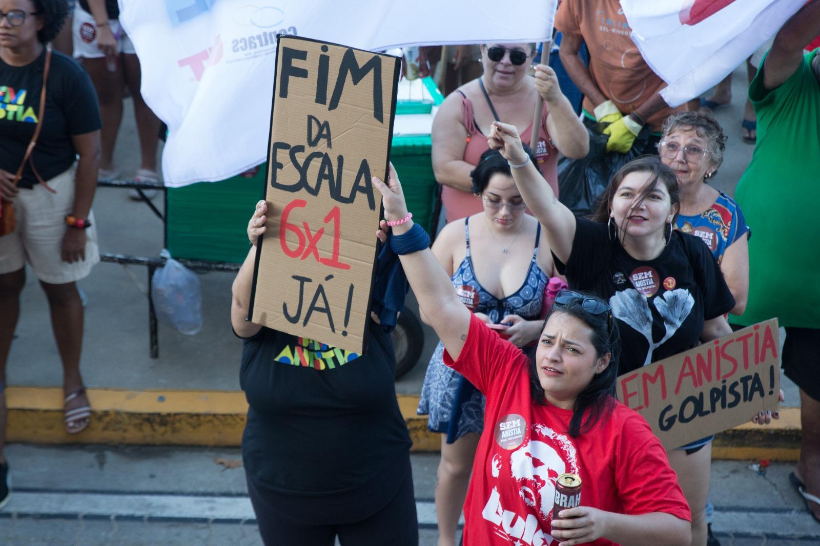 No percurso, os manifestantes levaram cartazes e bandeiras, com frases como "sem anistia pra golpista", "fim da escala 6x1" e "quando o povo se junta, o Congresso perde o poder".