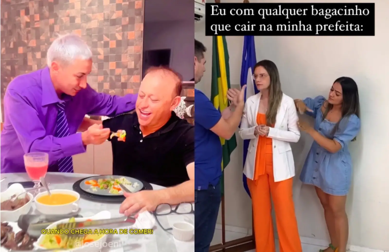 O diferencial, nestes casos, é a publicação feita em colaboração entre os perfis do humorista e do prefeito José Joeni. Mas ele não é o único a usar a estratégia. Em publicação conjunta com a prefeita de Limoeiro do Norte, Dilmara Amaral (Republicanos), a criadora de conteúdo Clarice Andrade mostra como se comporta quando vê "qualquer bagacinho cair na minha prefeita": "Minha prefeita não pode ficar suja".